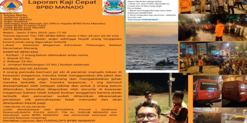 MANADO, Edisisatu.com, – Badan Penanggulangan Bencana Daerah (BPBD) bersama tim gabungan yang terdiri dari Basarnas, Inafis Polda Sulut, Bakamla, Pol Airud, Dishub Manado dan pihak pengelola Mall Mega Mas sampai hari ini Masih terus berupaya mencari dua korban yang tenggelam akibat peristiwa naas yang terjadi pada hari Senin ((3/11/2025).